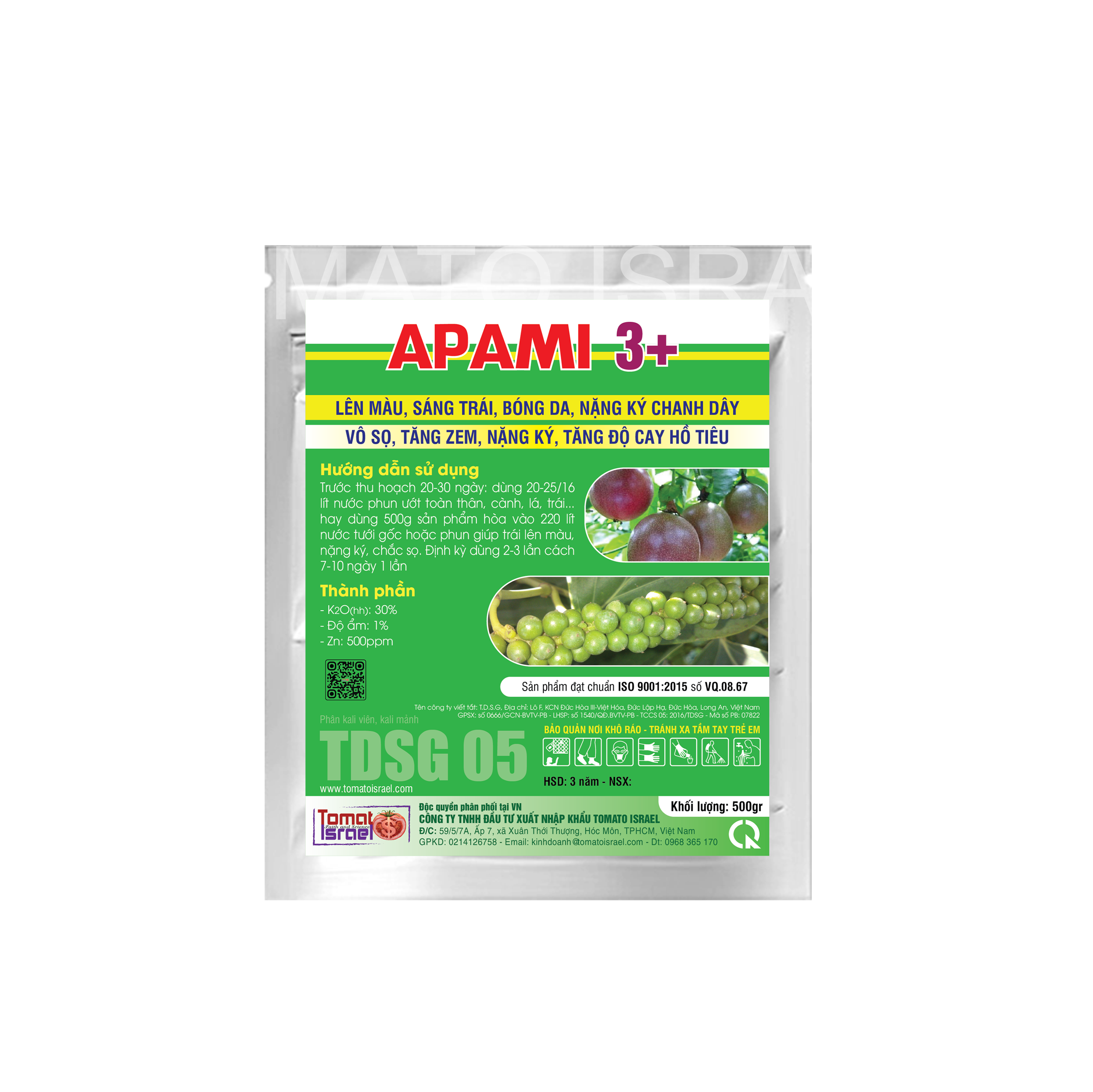 Sản phẩm được sản xuất dựa trên các nguồn nguyên liệu nhập khẩu Israel, APAMI 3+ cái tên không thể thiếu dành cho các loại cây công nghiệp giúp cây phát triển tốt lên màu trái, nặng ký chanh dây, vô sọ, tăng zem, tăng độ cay hồ tiêu giúp tăng năng suất.