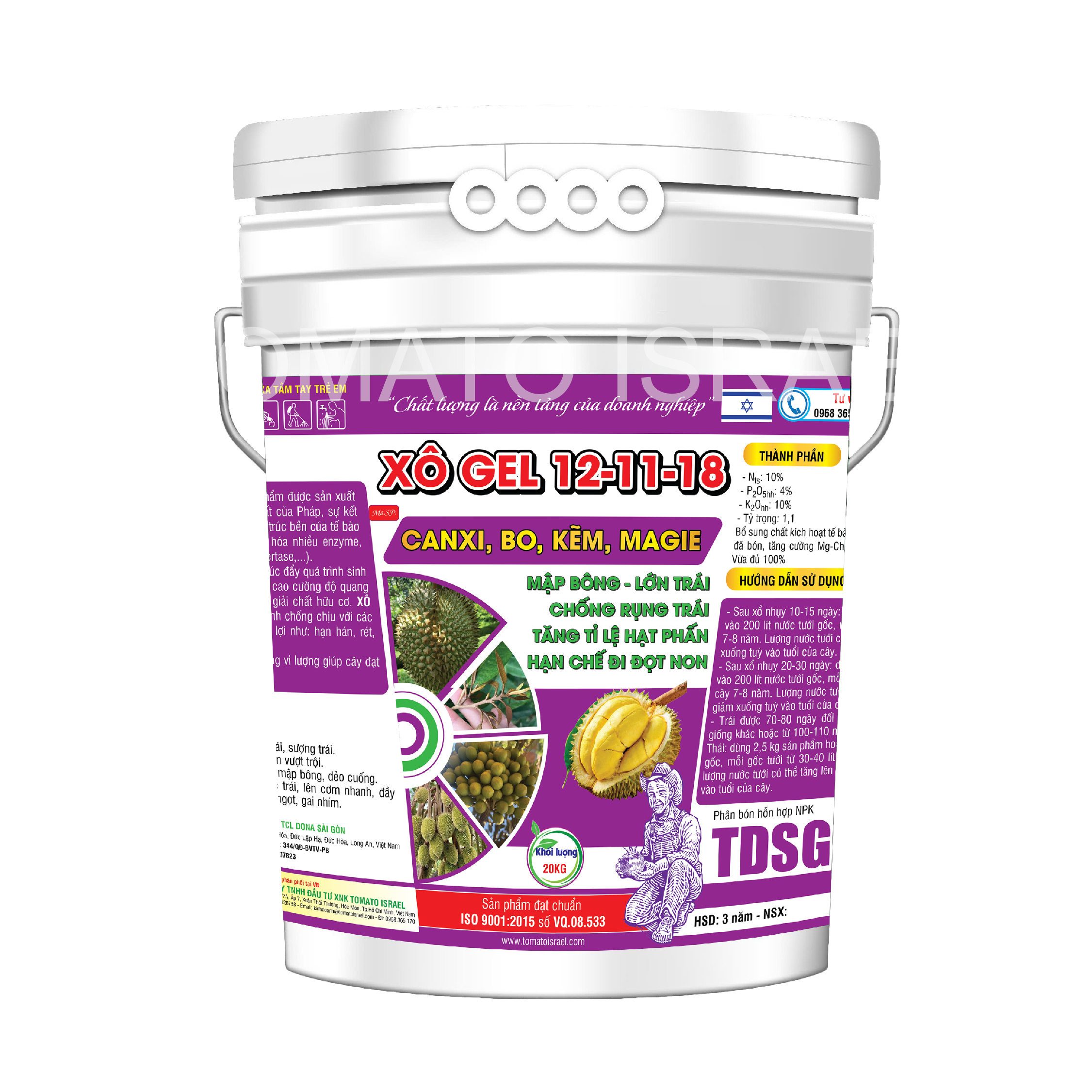 XÔ GEL 12-11-18 là sản phẩm được sản xuất theo công nghệ tiên tiến nhất của Pháp, sự kết hợp đa dinh dưỡng theo cấu trúc bền của tế bào thực vật, có tác dụng hoạt hóa nhiều enzyme, trao đổi gluxit (Amilaza, invertase,...). Sản phẩm bổ sung đa trung vi lượng giúp cây đạt tối đa năng suất.
